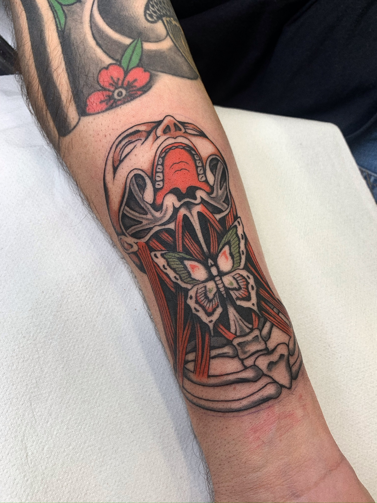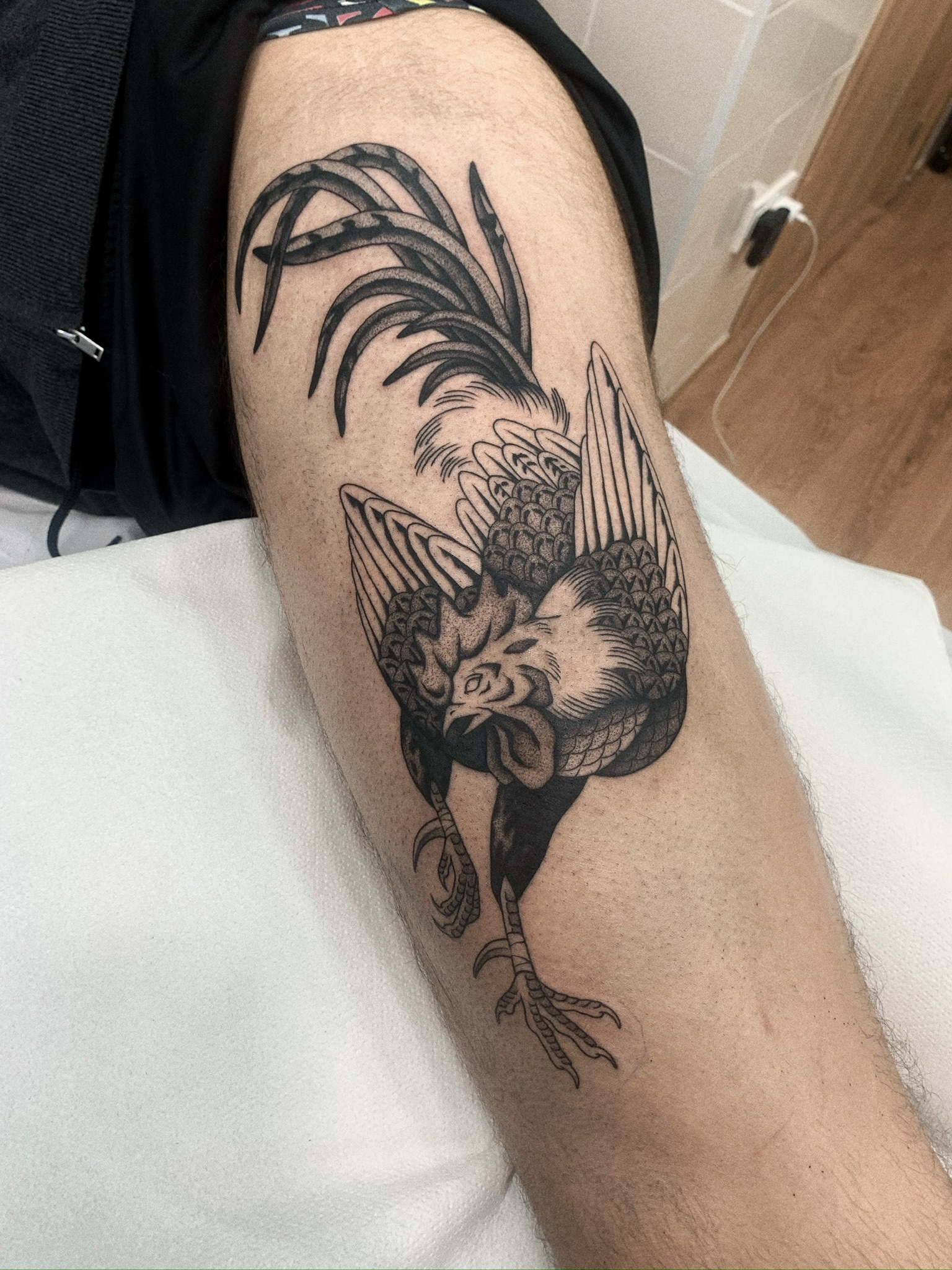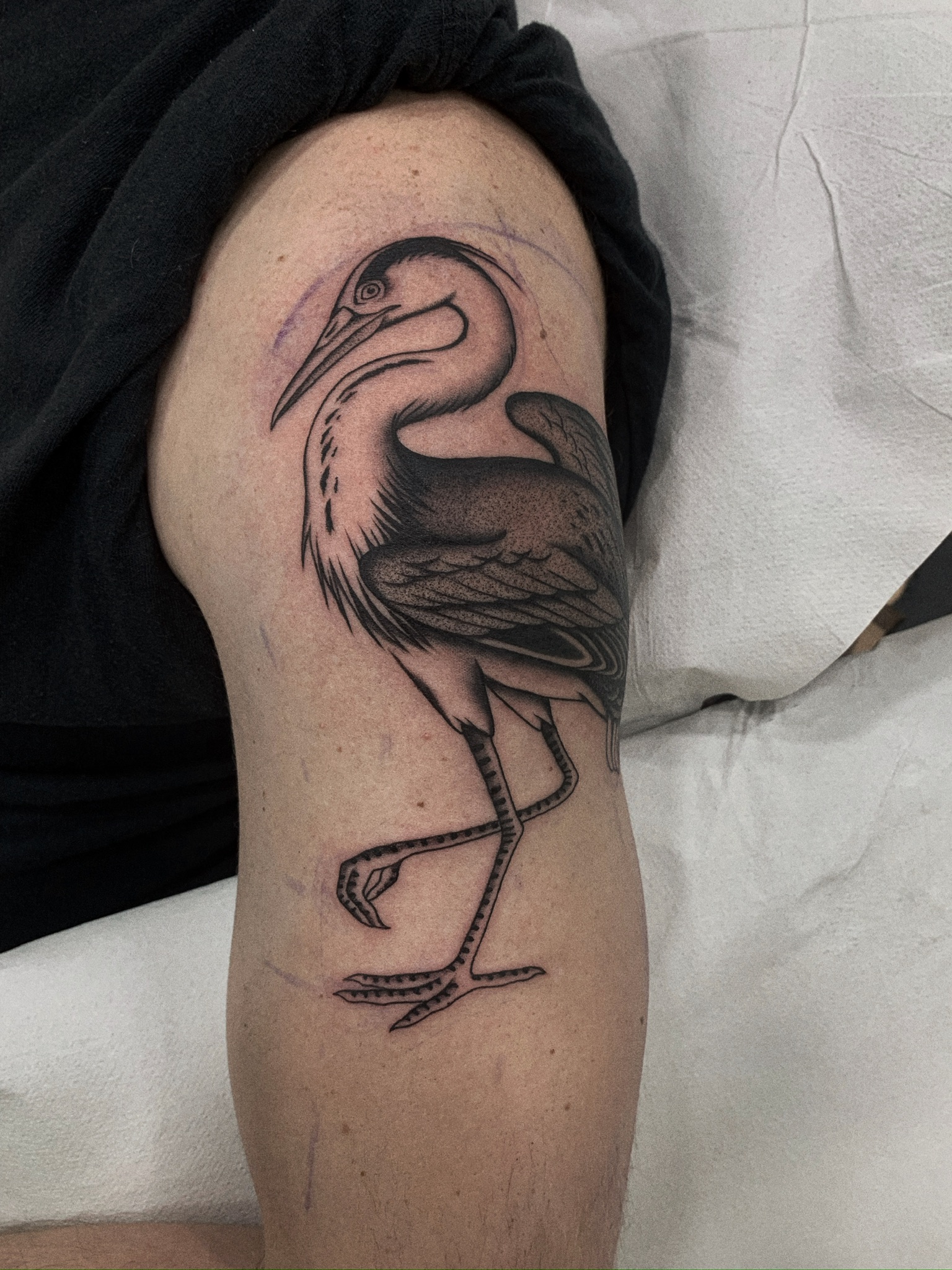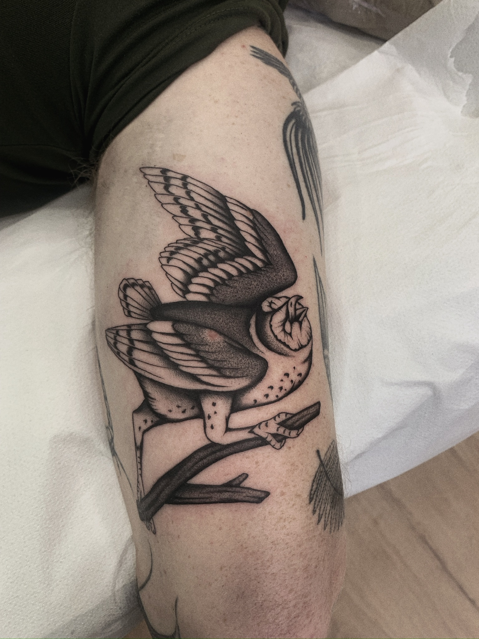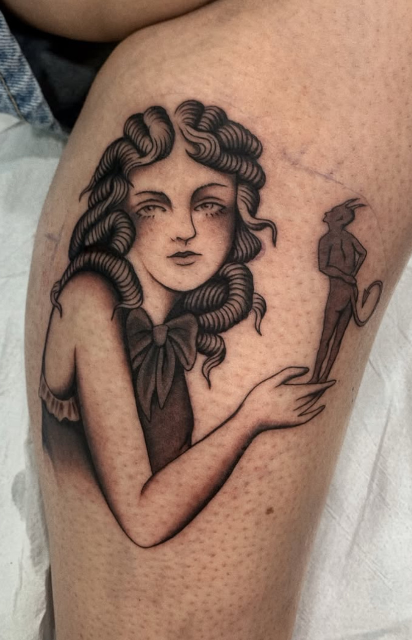 El trabajo de Ainara se caracteriza por una mirada elegante y sensible hacia el tatuaje tradicional. Su estilo combina la limpieza del trazo clásico con una composición muy cuidada y un uso expresivo del negro y el color.